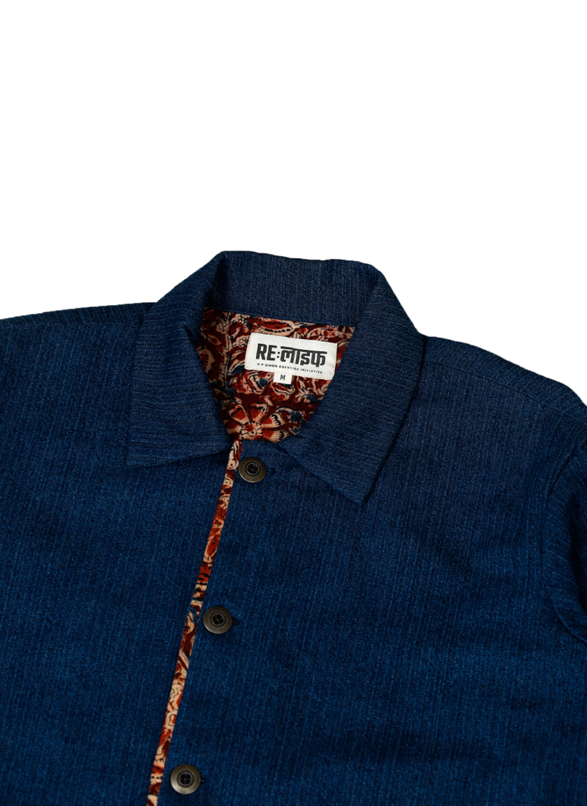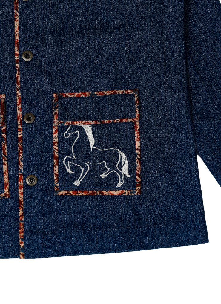 This jacket is crafted from surplus indigo denim and block print end cuts, reimagined into a stunning piece of contemporary sustainable design. It features intricate animal appliqué details, contrast lining with piping, and embroidered patch pockets, making it a true statement of conscious craftsmanship.