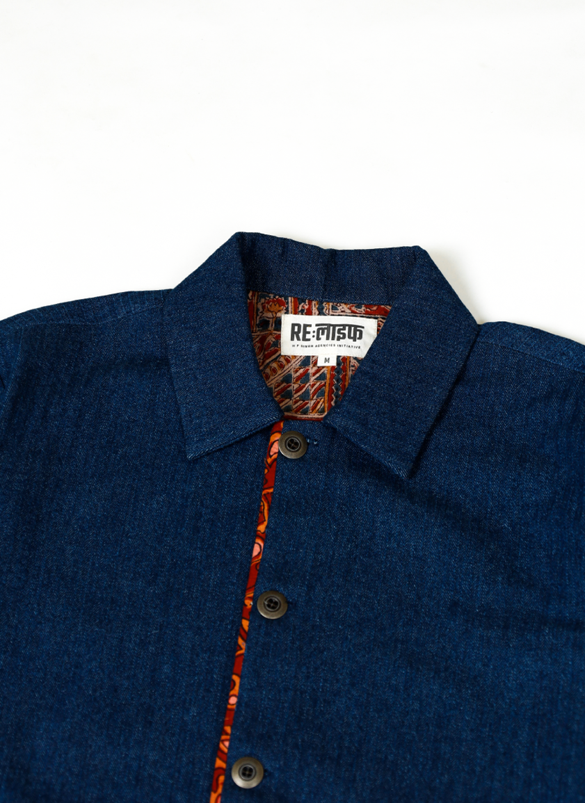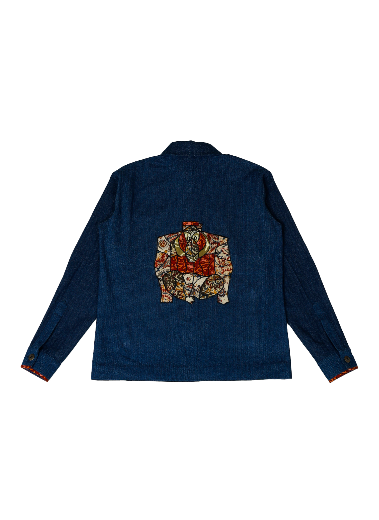 This jacket is crafted from surplus indigo denim and block print end cuts, reimagined into a stunning piece of contemporary sustainable design. It features intricate animal appliqué details, contrast lining with piping, and embroidered patch pockets, making it a true statement of conscious craftsmanship.