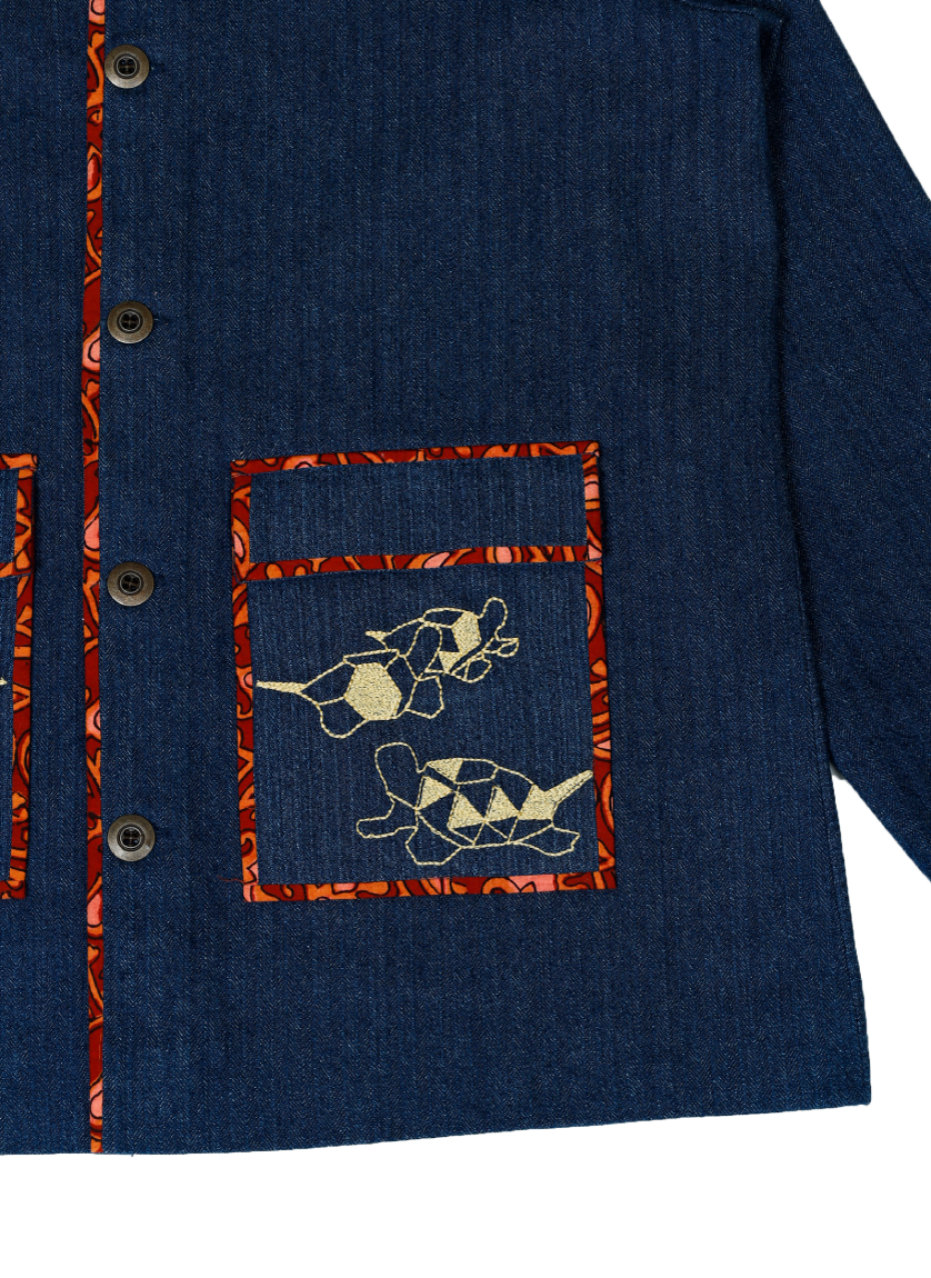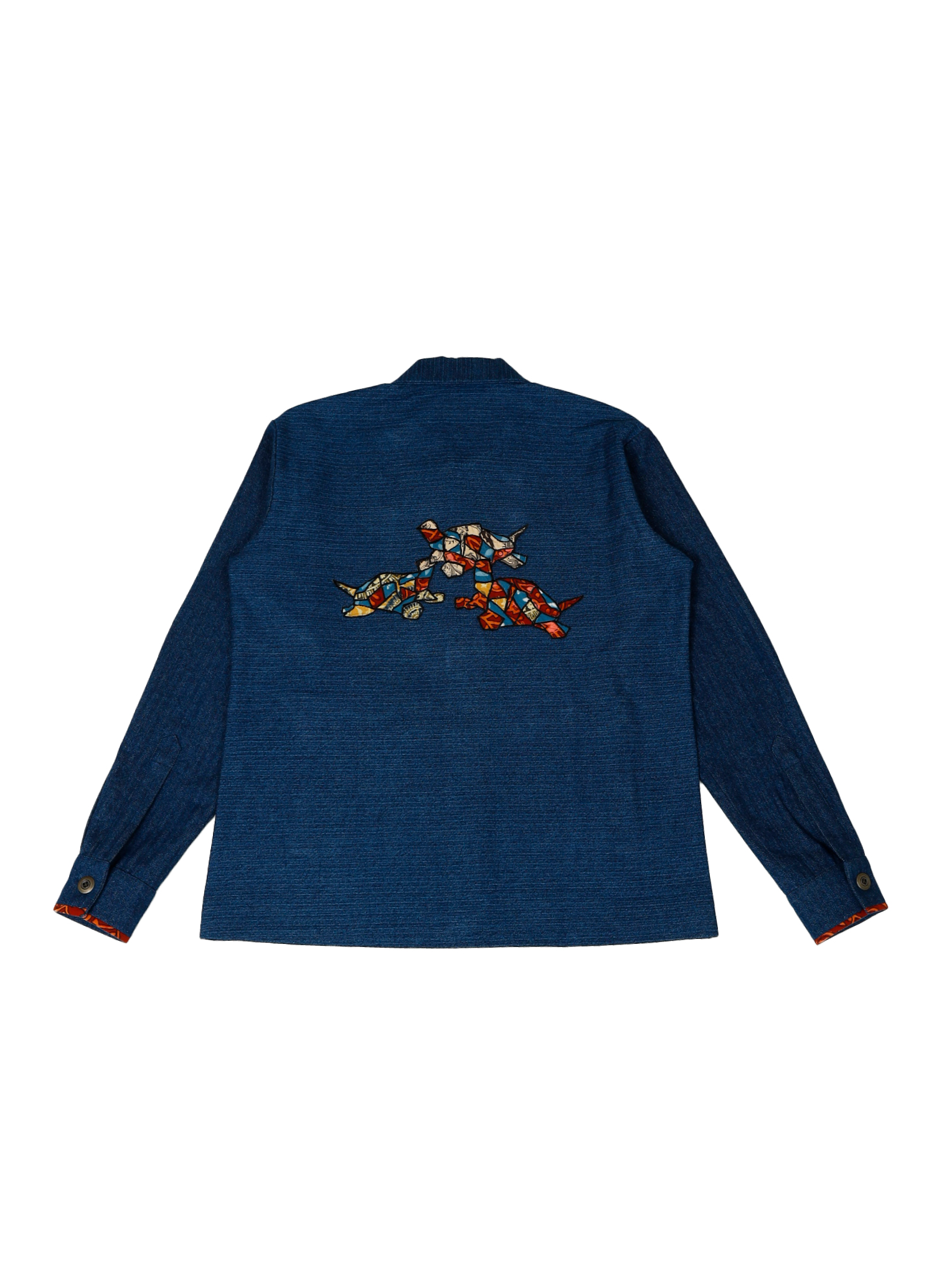 This jacket is crafted from surplus indigo denim and block print end cuts, reimagined into a stunning piece of contemporary sustainable design. It features intricate animal appliqué details, contrast lining with piping, and embroidered patch pockets, making it a true statement of conscious craftsmanship.