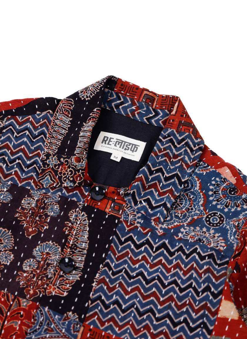 This jacket is crafted from Ajrakh fabric end cuts into patch work fabric and reimagined into a stunning piece of contemporary sustainable design. Designed with intricate Kantha details flat collar and double welt pocket, this piece is our attempt at showcasing the potential of conscious design.