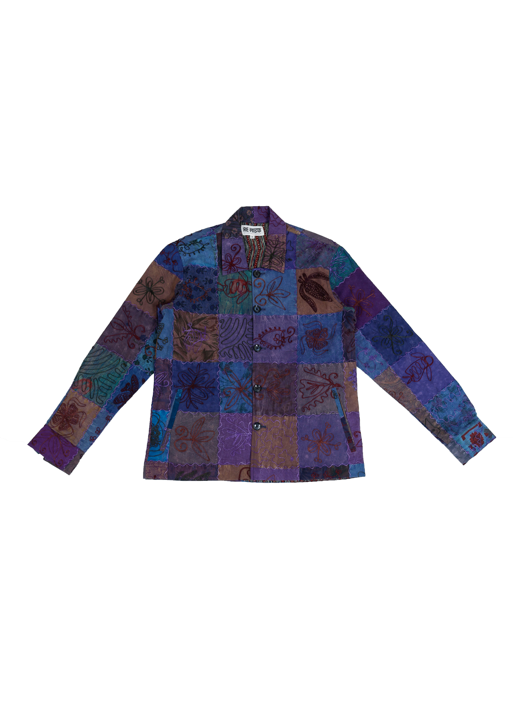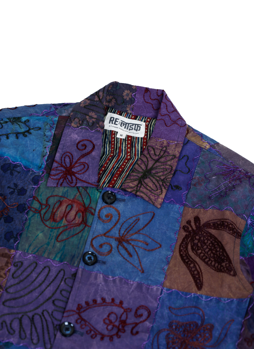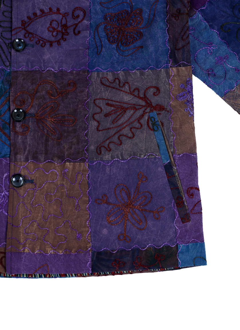 This jacket is crafted from upcycled patchwork fabrics and reimagined into a stunning piece of contemporary sustainable design. Designed with intricate Sujani embroidery and finished in a classic worker jacket silhouette, it features a flat collar and button fastening, this piece is our attempt at showcasing the potential of conscious design.