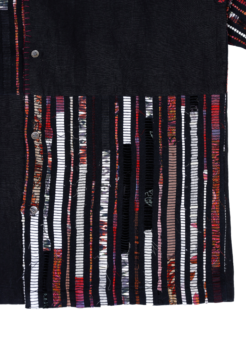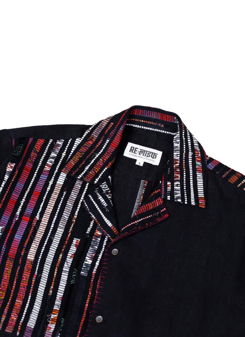 This shirt is crafted from upcycled fabric waste and reimagined into a stunning piece of contemporary sustainable design. Made in collaboration with Paiwand, who have beautifully reweaved fabric end-cuts into intricate, upcycled textiles, this piece reflects the beauty of conscious craftsmanship. Designed with geometric panel patchwork, this shirt is a statement of thoughtful minimal design.