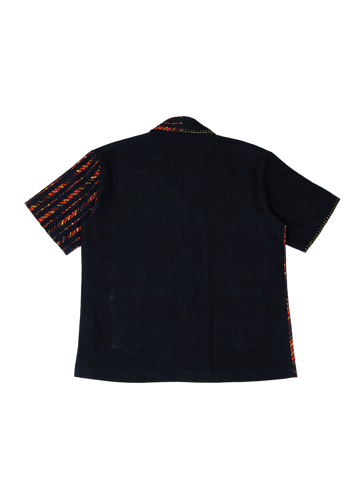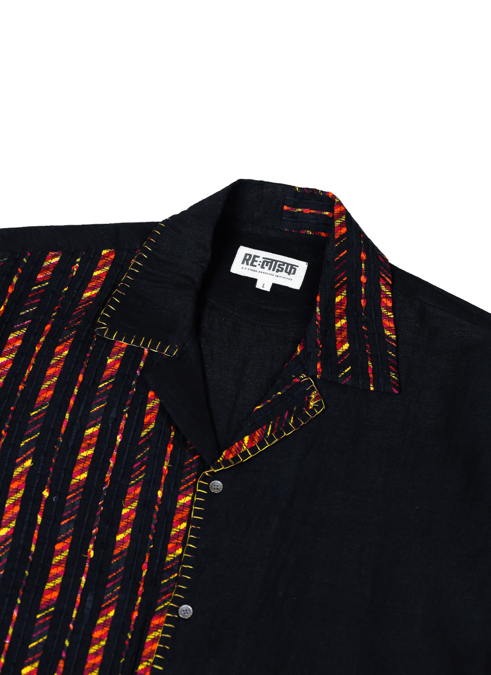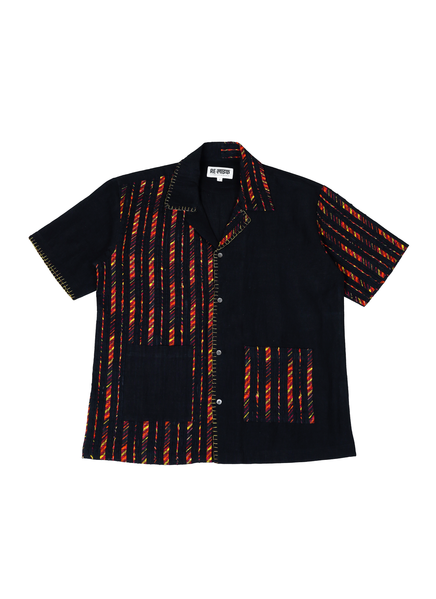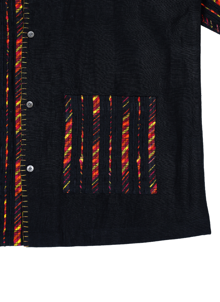 This shirt is crafted from upcycled fabric waste and reimagined into a stunning piece of contemporary sustainable design. Made in collaboration with Paiwand, who have beautifully reweaved fabric end-cuts into intricate, upcycled textiles, this piece reflects the beauty of conscious craftsmanship. Designed with bold color-blocking, contrast patch pockets, and visible hand-finished details, this shirt is a statement of thoughtful and modern design.