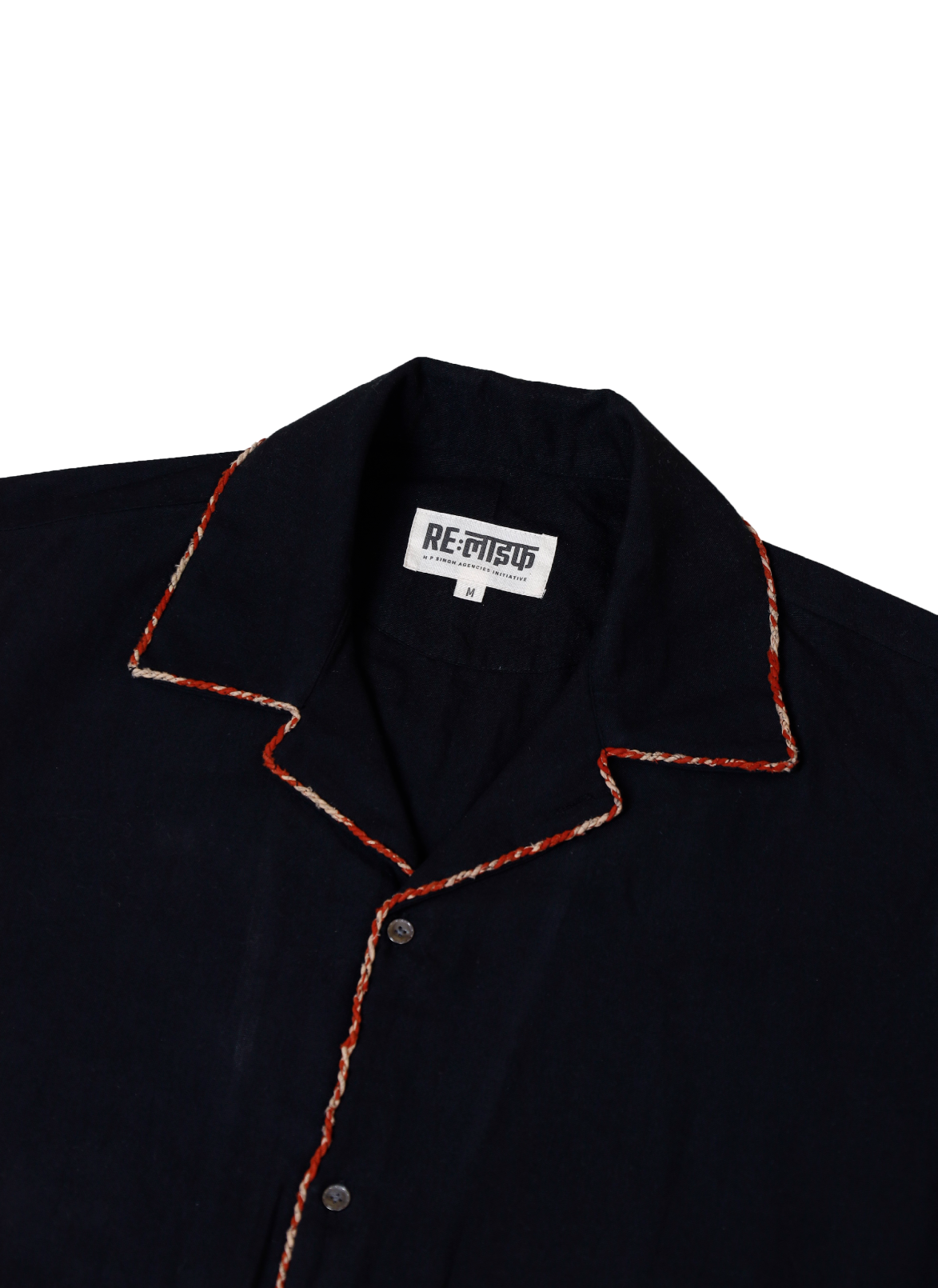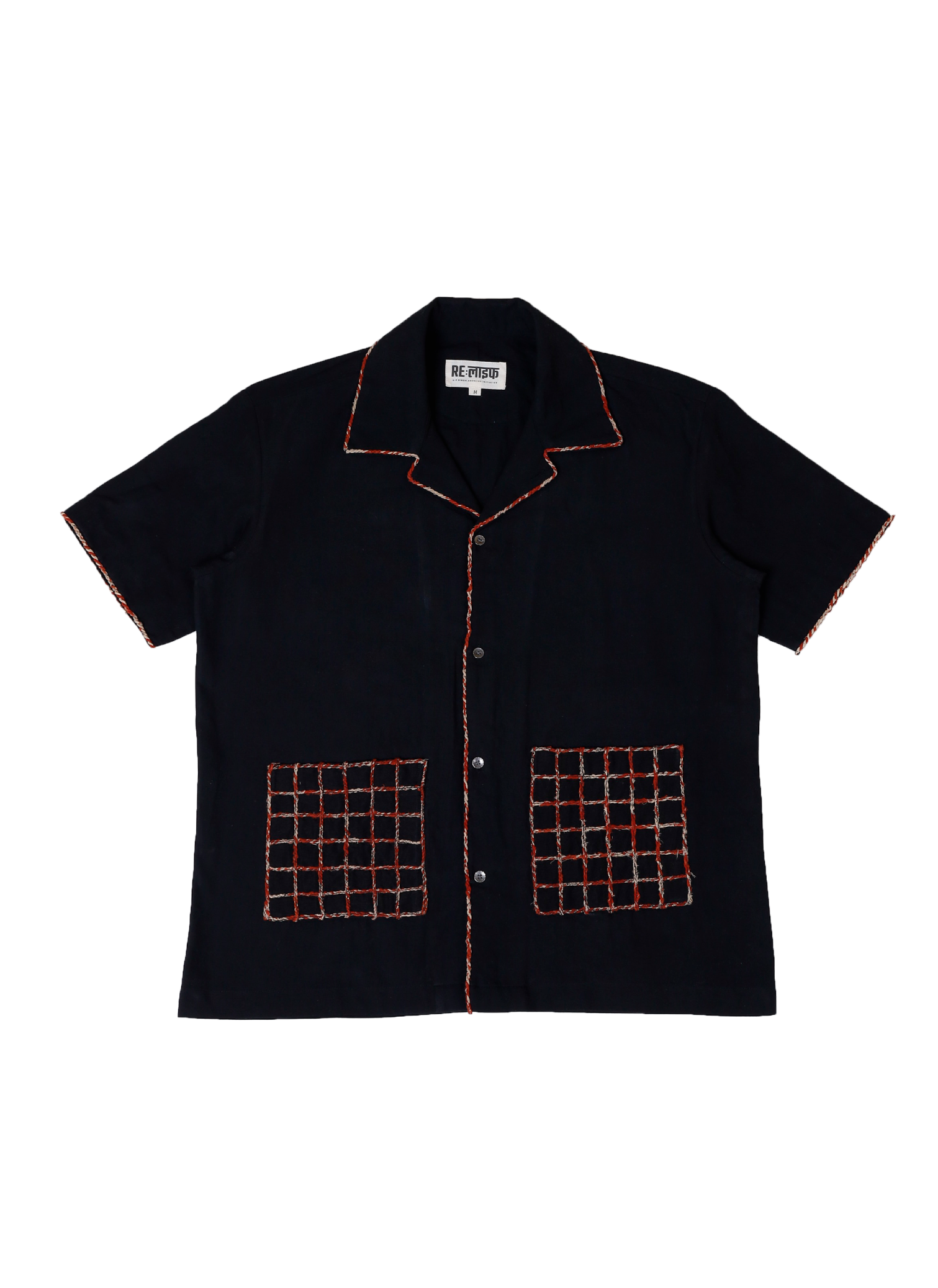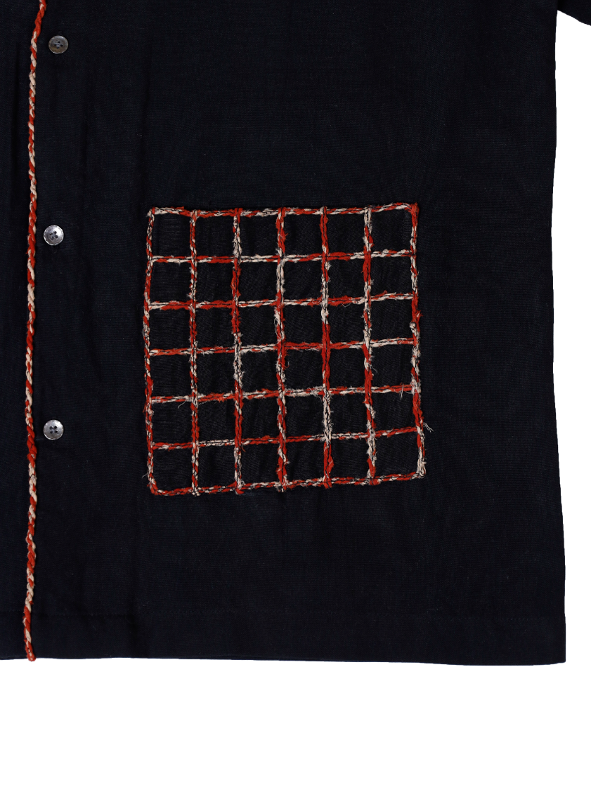 This short-sleeve button-up shirt is crafted from upcycled cotton fabric and reimagined into a stunning piece of contemporary sustainable design. Designed with intricate hand-stitched dori embroidery on the pockets—made from repurposed fabric scraps—and dori embroidery detailing along the collar, placket, and sleeves, this piece is our attempt at showcasing the potential of conscious design.