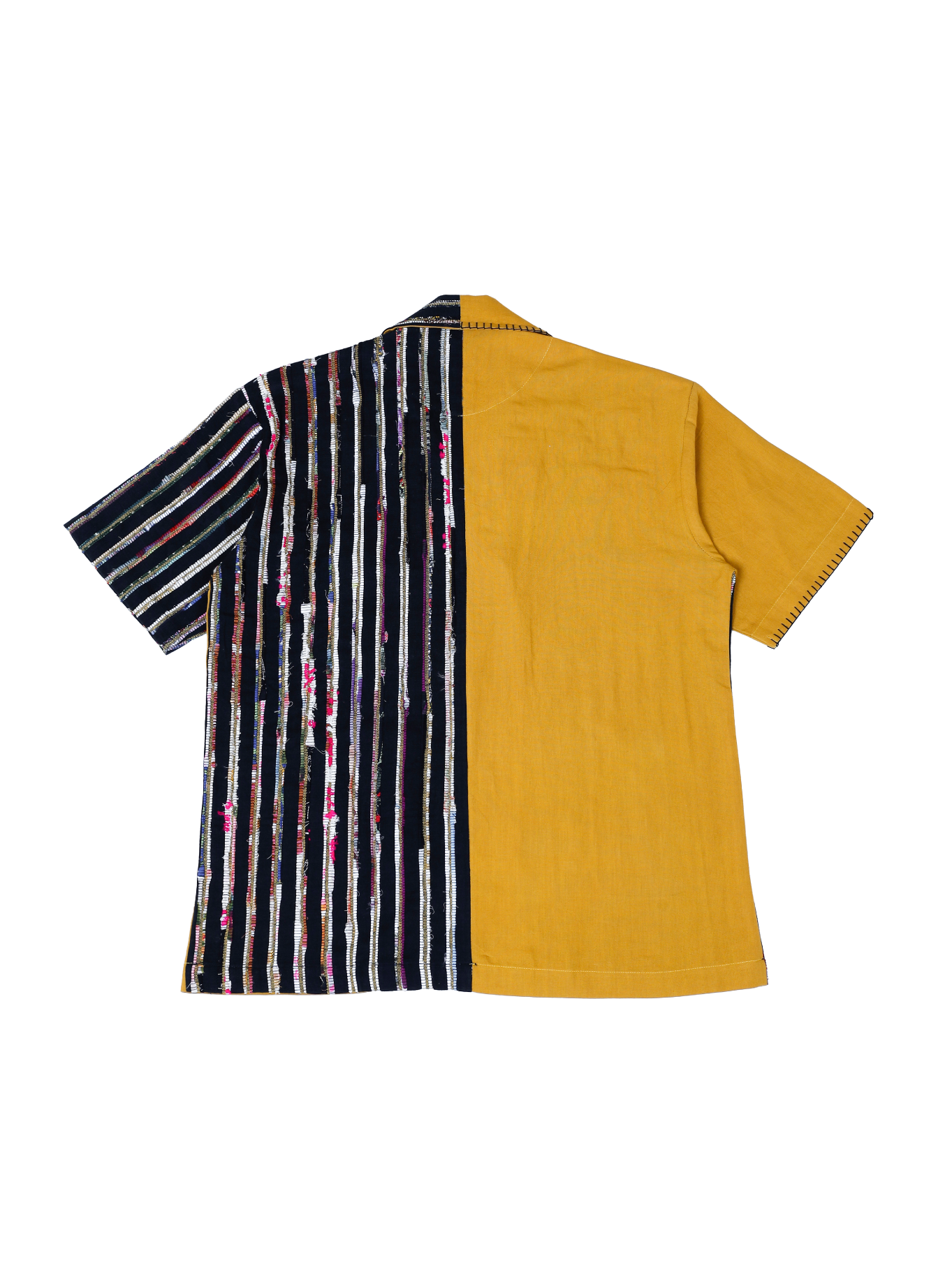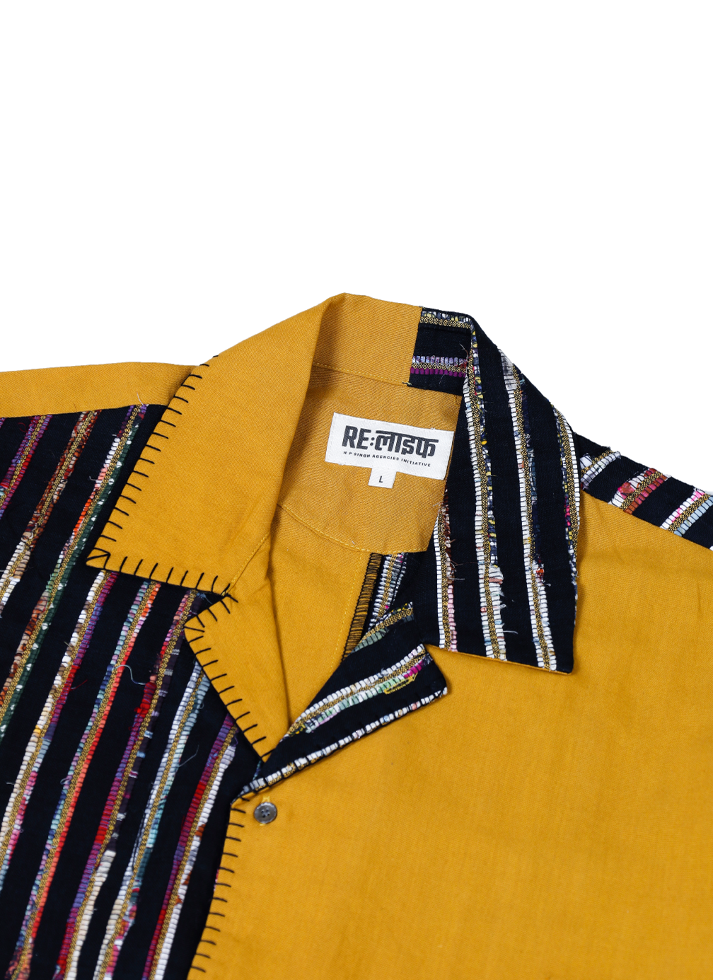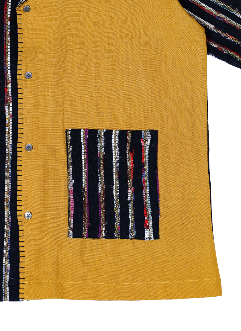 This shirt is crafted from upcycled fabric waste and reimagined into a stunning piece of contemporary sustainable design. Made in collaboration with Paiwand, who have beautifully reweaved fabric end-cuts into intricate, upcycled textiles, this piece reflects the beauty of conscious craftsmanship. Designed with bold color-blocking, contrast patch pockets, and visible hand-finished details, this shirt is a statement of thoughtful and modern design.