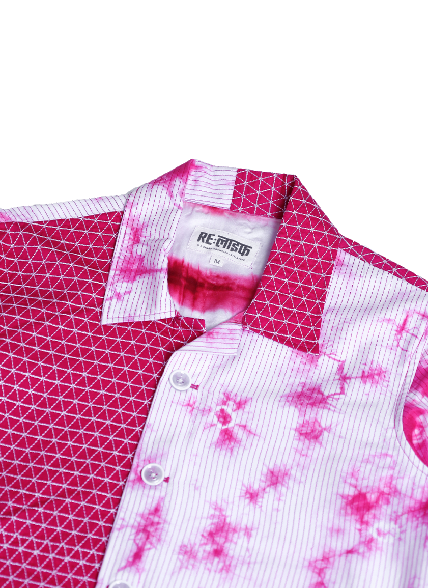 The material used was leftover end cuts, transformed through tie-dye and machine tagai stitch work to create a one-of-a-kind piece.