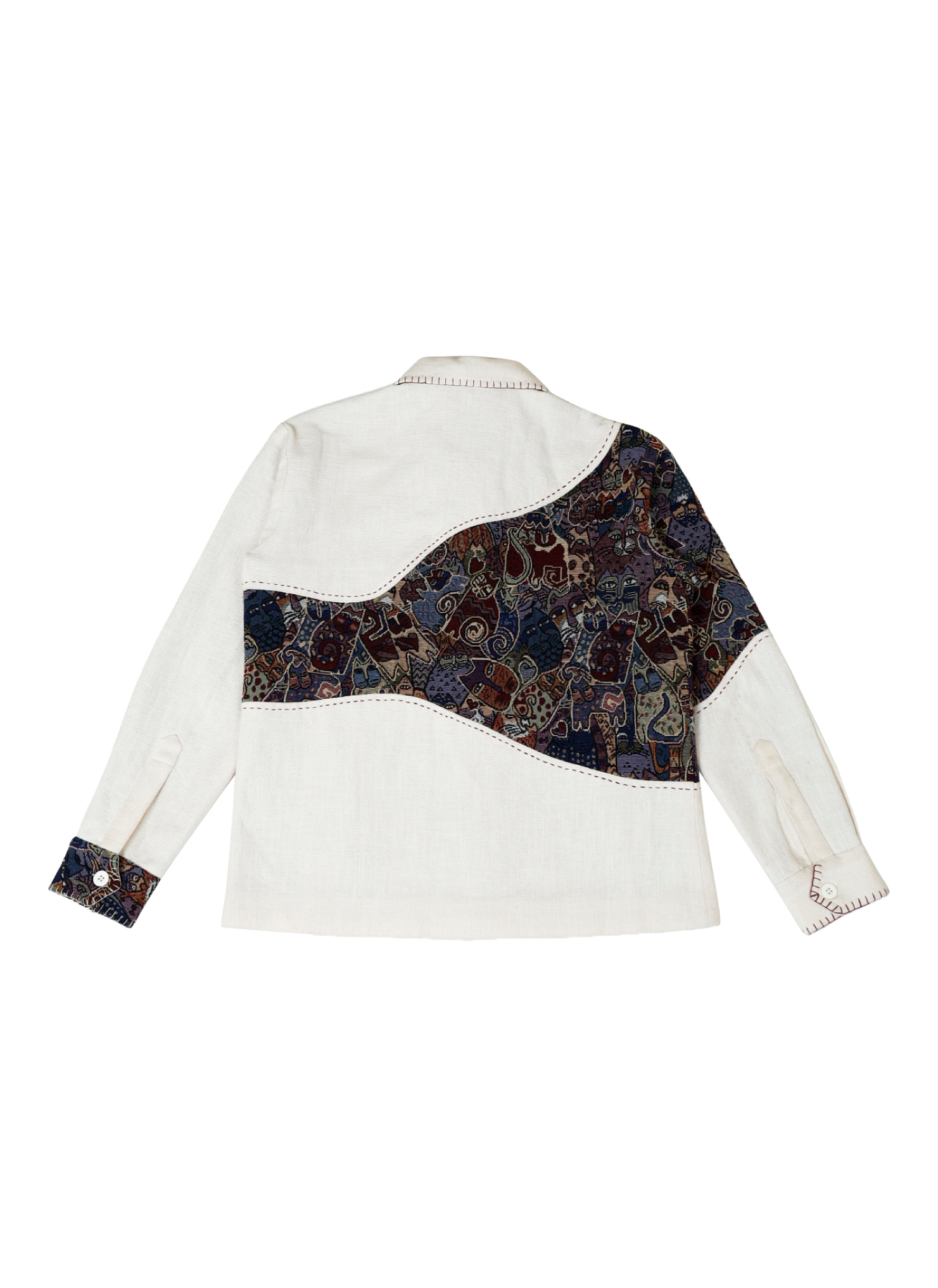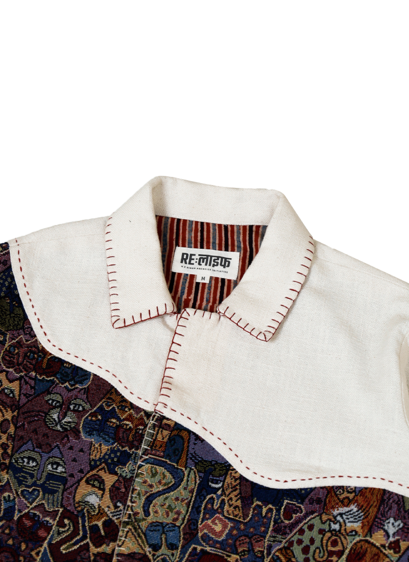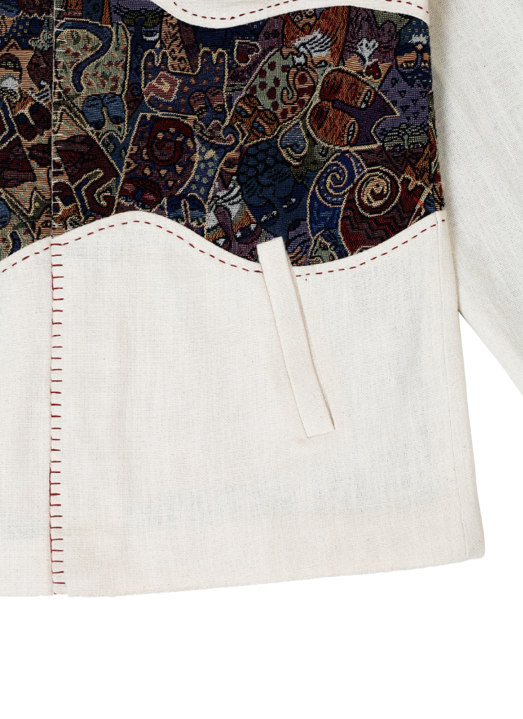 This jacket is crafted from jacquard and white fabric end cuts and reimagined into a stunning piece of contemporary sustainable design. Designed with a curved panel detail and hand-done blanket hole stitch finishing, this piece is our attempt at showcasing the potential of conscious design.