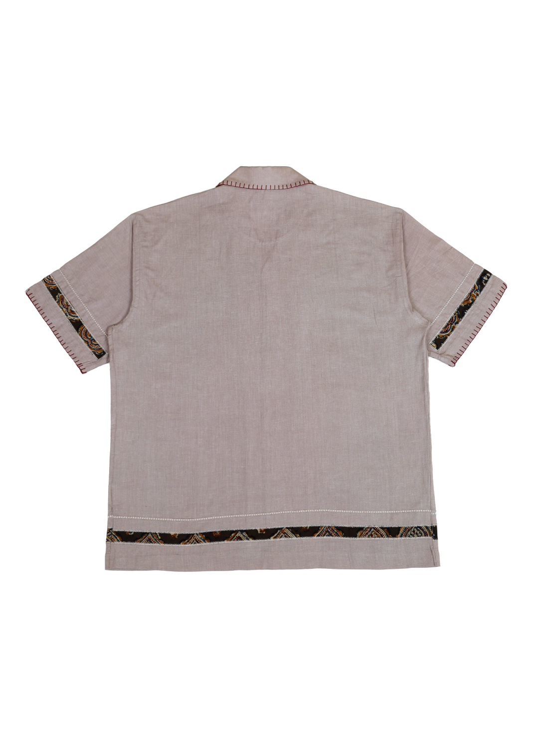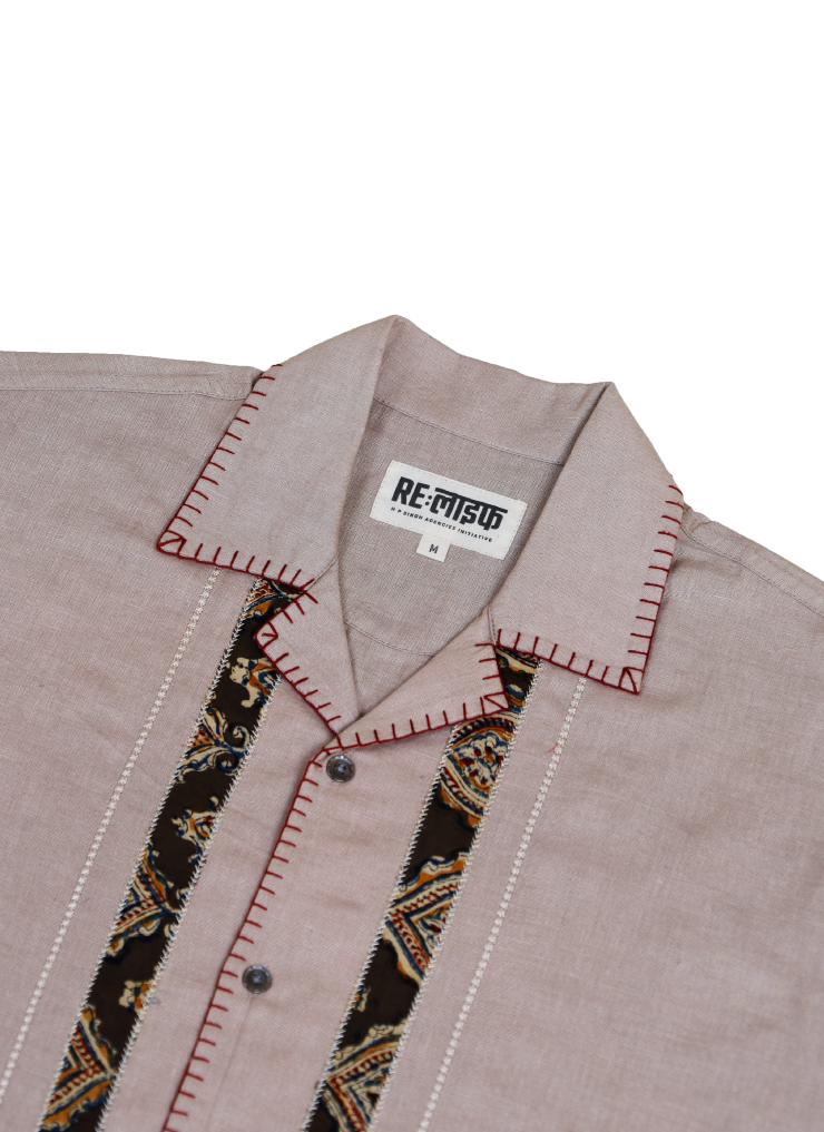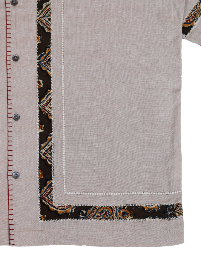 This shirt is crafted from upcycled beige cotton–linen end-cuts and features twin vertical Ajrakh-print appliqué borders framing the front panels, hem, and sleeve cuffs. Each rich block-print strip is machine-stitched into place, then edged with hand-stitched silk-thread blanket stitching in deep maroon at the collar and cuffs, plus fine ivory running-stitch frames along the body. The open camp collar, snap-button front, and relaxed boxy silhouette make it an effortless statement piece. Lightweight and breathable, the natural fiber blend drapes elegantly and keeps you cool. Ethically produced and beautifully detailed, this shirt transforms rescued fabrics into a refined testament to heritage craft.
