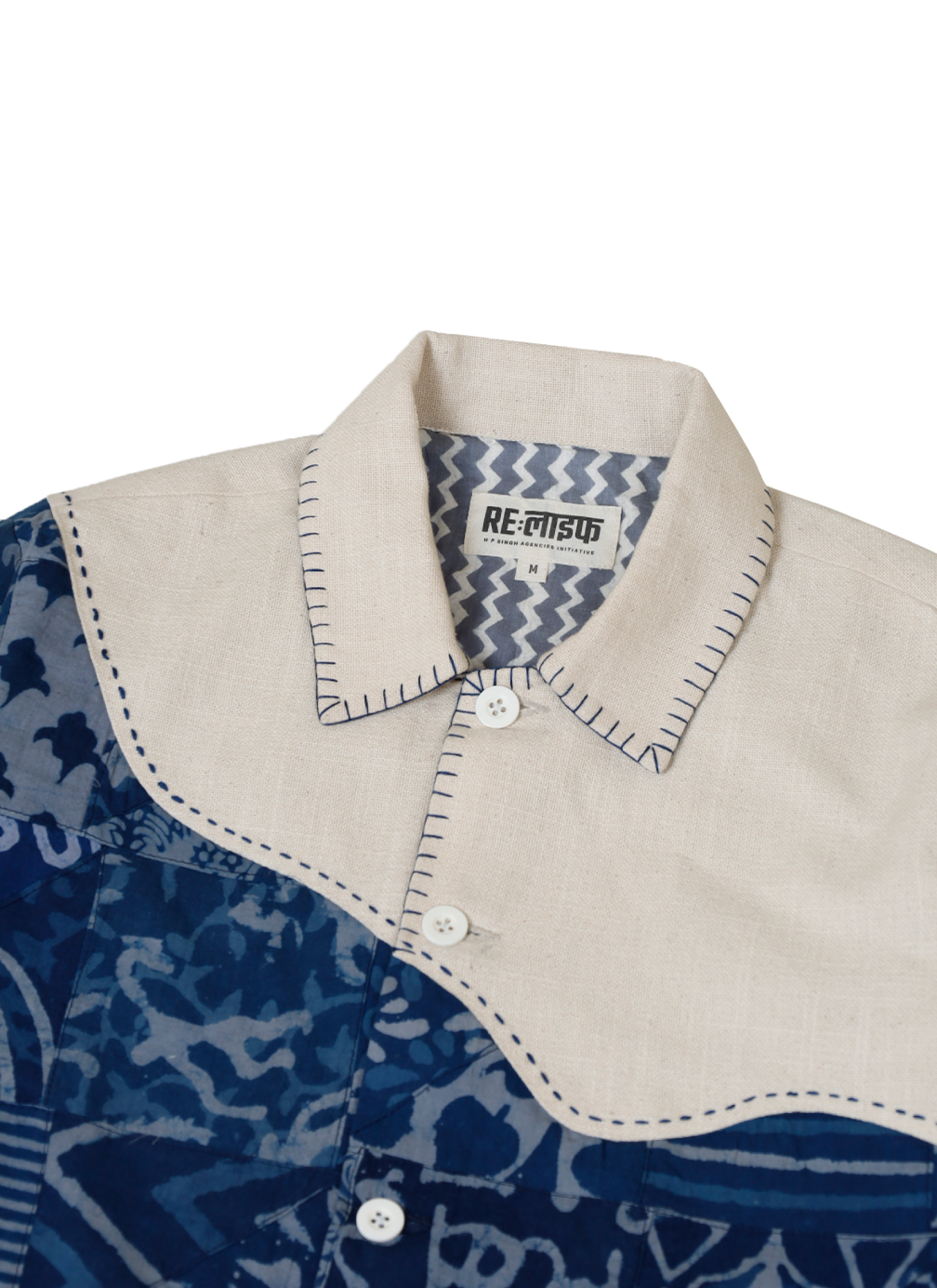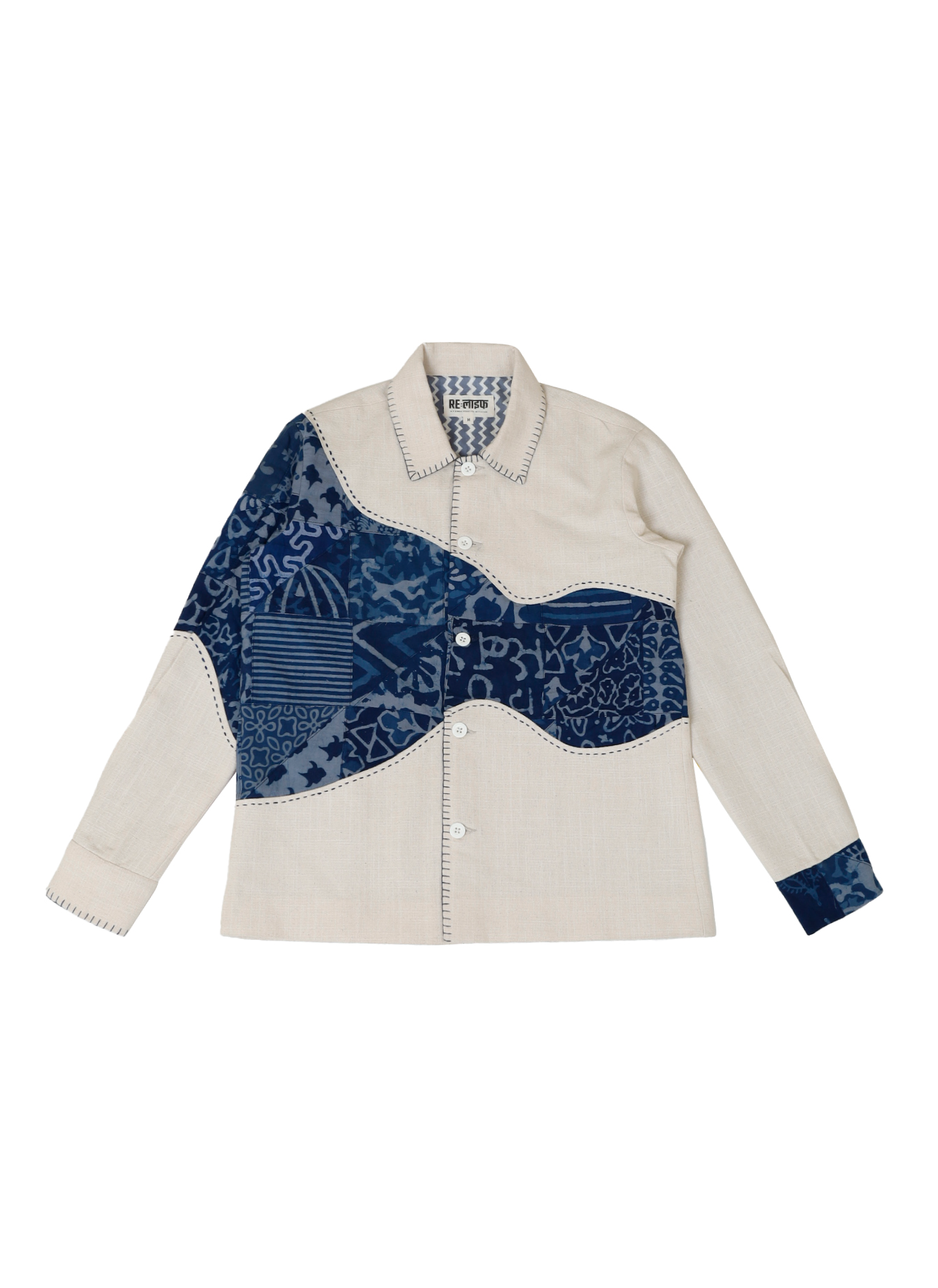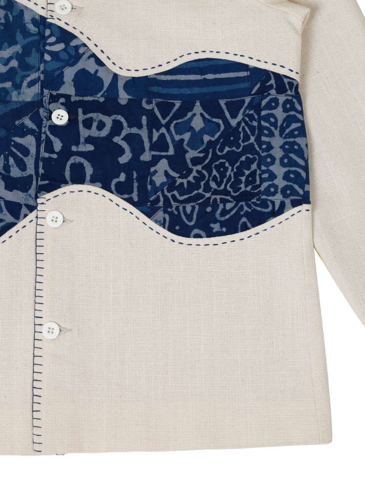 This jacket is crafted from soft, off-white upcycled cotton and features a flowing wave of indigo block-printed textiles across the chest and sleeve. Designed with curved appliqué construction and finished with hand-stitched detailing along the seams, collar, and cuffs, this piece merges movement and craftsmanship into a serene, wearable form.
