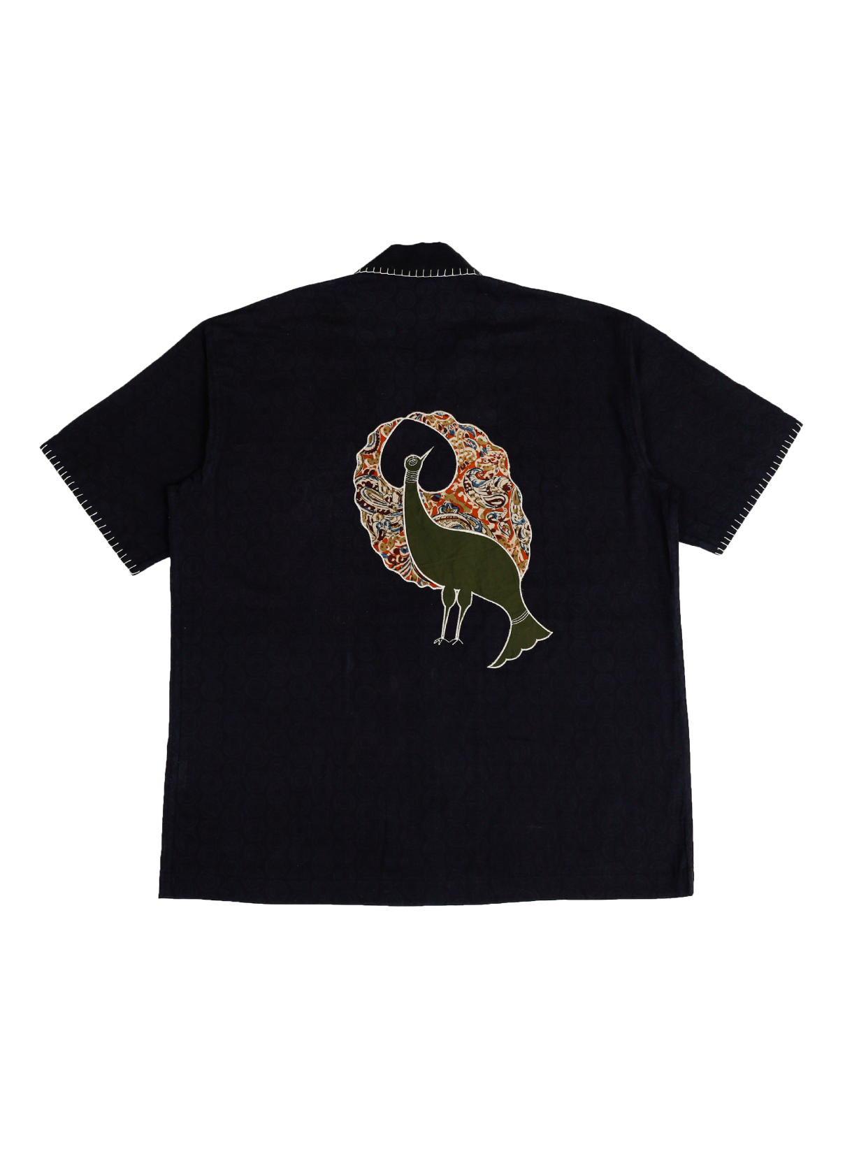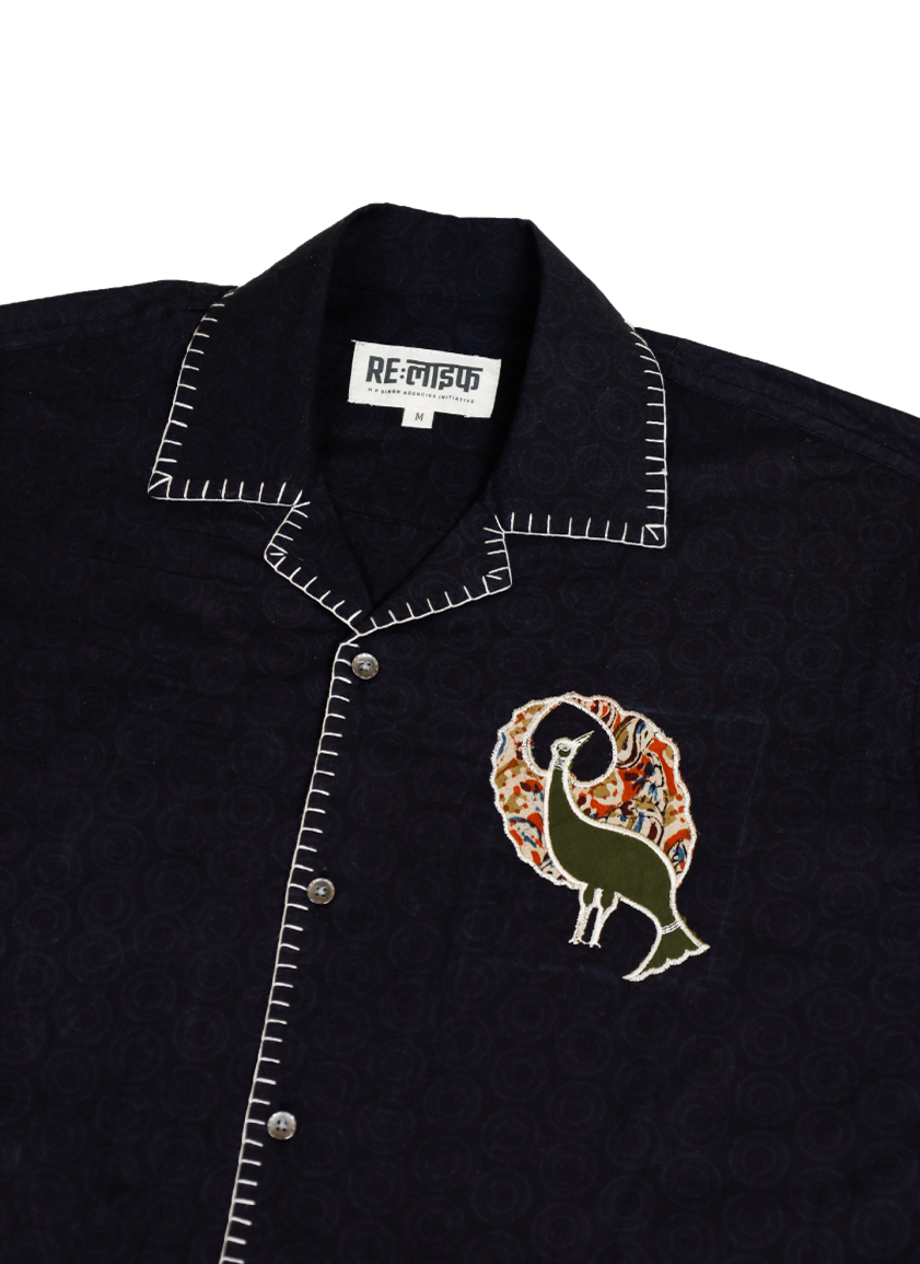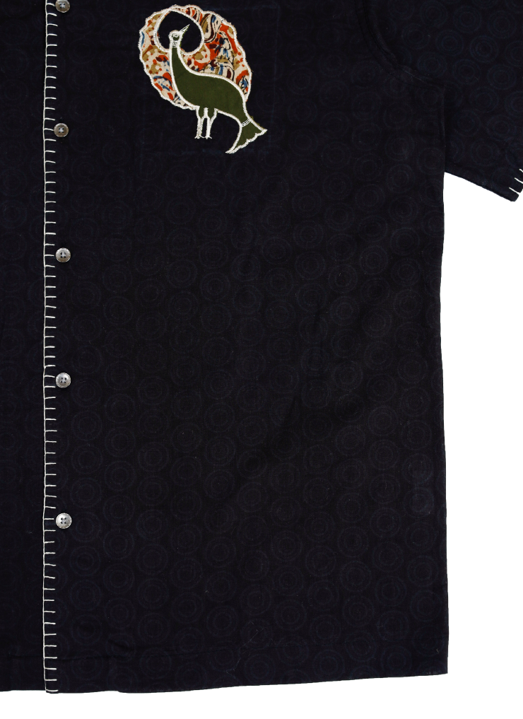 This short-sleeve button-up shirt is crafted from upcycled block-printed cotton fabric, transformed through overdyeing into a striking piece of contemporary sustainable design. The shirt features intricately machine-appliquéd and embroidered panels using repurposed fabric scraps, including patchworked Kalamkari and solid colour remnants that form rich, layered animal motifs on the back.